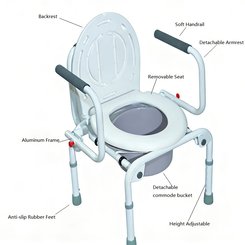 This Bedside commode is made from aluminum frame and plastic seat and detachable commode bucket,which combines lightweight mobility with durable, the weight capacity is up to 120kg.The adjustable height, removable armrests, and detachable commode system allow easy adaptation to various care needs. Ideal for hospitals, nursing facilities, and home care providers seeking practical and durable equipment